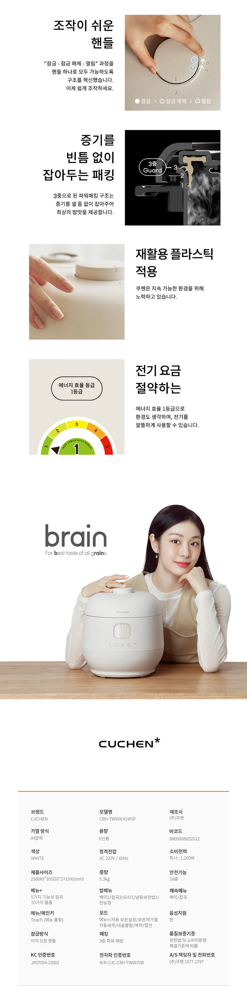 | A/S 책임자와 전화번호 | 쿠첸서비스센터 1577-2797 |